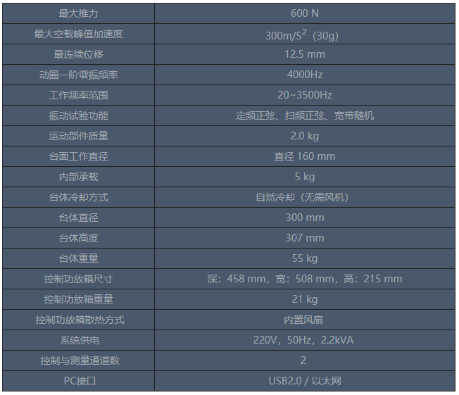 桌面上的振動(dòng)臺(tái)。220V供電。自然冷卻(無需風(fēng)機(jī))。適合2kg以下試件。正弦、隨機(jī)振動(dòng)。主要技術(shù)參數(shù)表